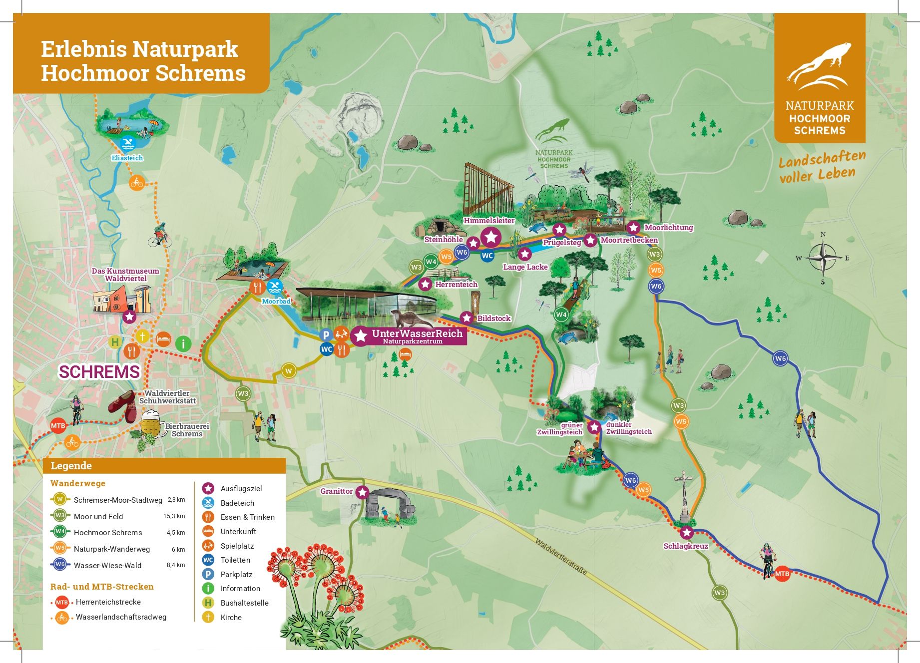Im Rahmen des Pilotprojektes des Vereines der Naturparke NÖ wurde in einem partizipativen Prozess eine neue Erlebniskarte vom Naturpark Hochmoor und der Stadt Schrems erstellt. Ersichtlich sind die Attraktionen in Form von Points Of Interest (POI's) der Naturparkregion, welche durch diverse Wanderrouten und auch Fahrradtouren verknüpft sind und einen Überblick und Orientierung für alle Besucher*innen im ansprechend, moderenen Design bieten soll.